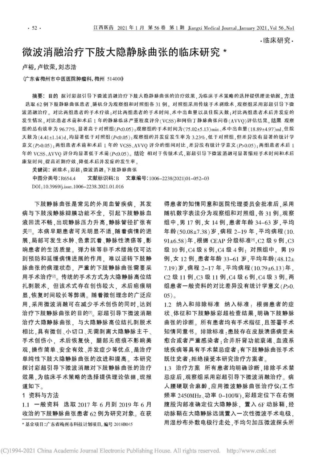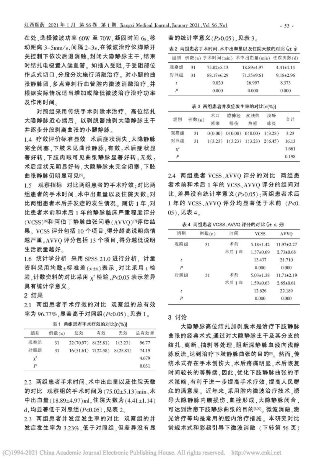 结果:观察组的总有效率为96.77%,显著高于对照组(P<0.05);观察组的手术时间为(75.02±5.13)min、术中出血量(18.89±4.97)ml,住院天数为(4.41±1.14)d,均显著低于对照组(P<0.05);观察组的并发症发生率为 3.23%,低于对照组,但差异没有显著的统计学意义(P>0.05);两组患者术前和术后 1 年的 VCSS、AVVQ 评分的组间对比,差异没有统计学意义(P>0.05);两组患者术后1年的 VCSS、AVVQ 评分均显著低于术前(P<0.05)。
