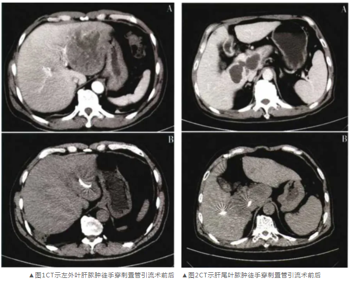 68例患者共置入71条引流管(其中3例为多发脓肿置双管引流),其中48例应用一步法,20例应用二步法。所有患者均一次穿刺置管操作成功,各抽吸出脓液25-600mL,手术平均时间约15min。几乎所有病例术后复査影像学(CT、超声)提示脓肿显著缩小、引流管位置满意(图1、2);管道 通畅性均维护良好。本组未出现明显出血、胆痿、 血气胸、胃肠道误伤等严重并发症,1个初期病例因脓液少量外溢继发局部腹膜炎经积极抗感染治疗后治愈;1例高龄患者因多发肝脓肿继发多脏器功能衰竭综合征死亡。所得脓液均行细菌培养及药敏试验,其中28例培养得肺炎克雷伯杆菌,19例培养得大肠杆菌,11例为葡萄球菌,7例为其他较少见细菌,其余未培养出致病菌;其中15例为混合致病菌感染。