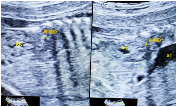 上图示正常双肾及肾上腺。(R-adrenal gland/R-AD:右侧肾上腺,L-adrenal gland/L-AD:左侧肾上腺,RK:右肾,LK:左肾,liver:肝,st:胃)