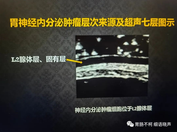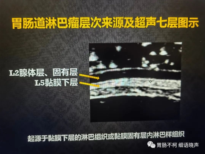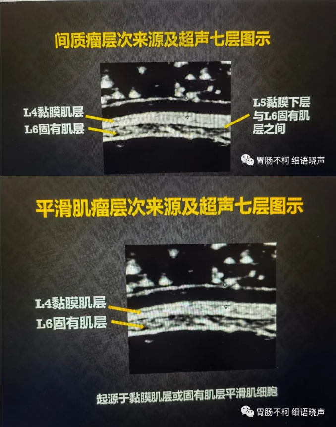 病例二,超声胃壁七层不显示、只显示五层时,自黏膜上皮线起始至肿块,胃壁五层显示了强(L1)-低(L2)-强(L3-5)三层线,强烈提示肿块跟L6(固有肌层)关系密切,结合混杂回声特点,诊断为间质瘤: