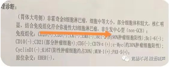 病例一,自黏膜上皮线起始至肿块,胃壁超声七层显示了强(LI)-低(L2)-强(L3)-低(L4)-强(部分L5)五层线,强烈提示肿块跟L5(黏膜下层)关系密切,结合肿块长轴与胃壁长轴一致的特点,超声首诊胃淋巴瘤,病理免疫组化结果证实: