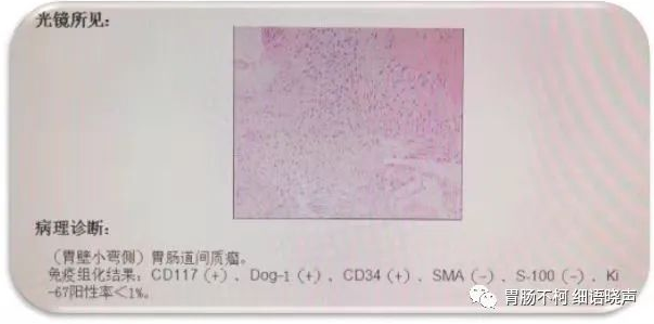 病例四,直径9.5cm的肿块,腔外型生长,放大图片清晰显示2.0cm左右的蒂与胃壁L6(固有肌层)相延续,结合形态及回声特点,超声首诊高危险度间质瘤,术后病理证实: