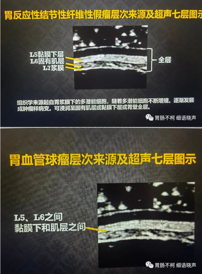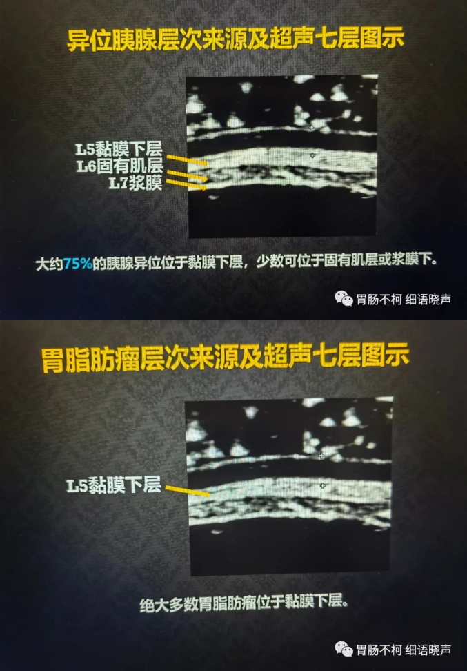 病例三,胃体前壁位于黏膜下层的异位胰腺,其前后均可见L5(黏膜下层)的部分强回声线,呈“黏膜下层分离征”: