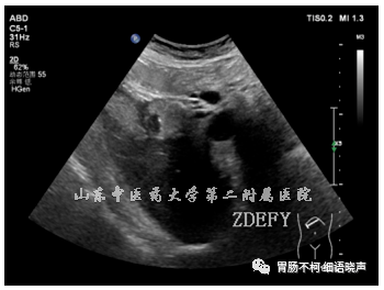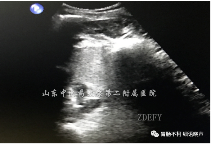 水充盈并放大图像后显示肿块近黏膜面可见黏膜表面上皮强回声线